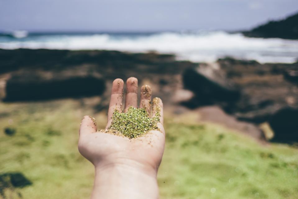 Olivine can be found throughout the island, typically as a mineral within the basalt rock. However, from the continuous pounding of waves or construction, the minerals can be broken away from the surrounding basalt.