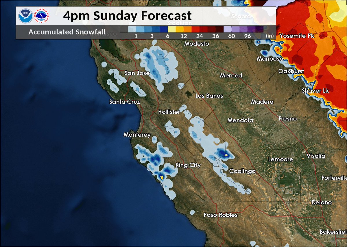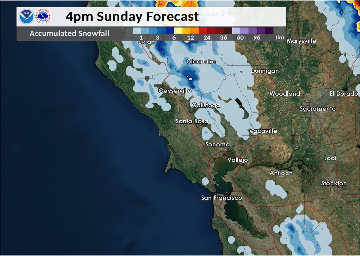 North Bay Mtns, East Bay Hills, & Santa Cruz Mtns: 2-4" above 1,500 ft; 4+" above 2,000 ft.