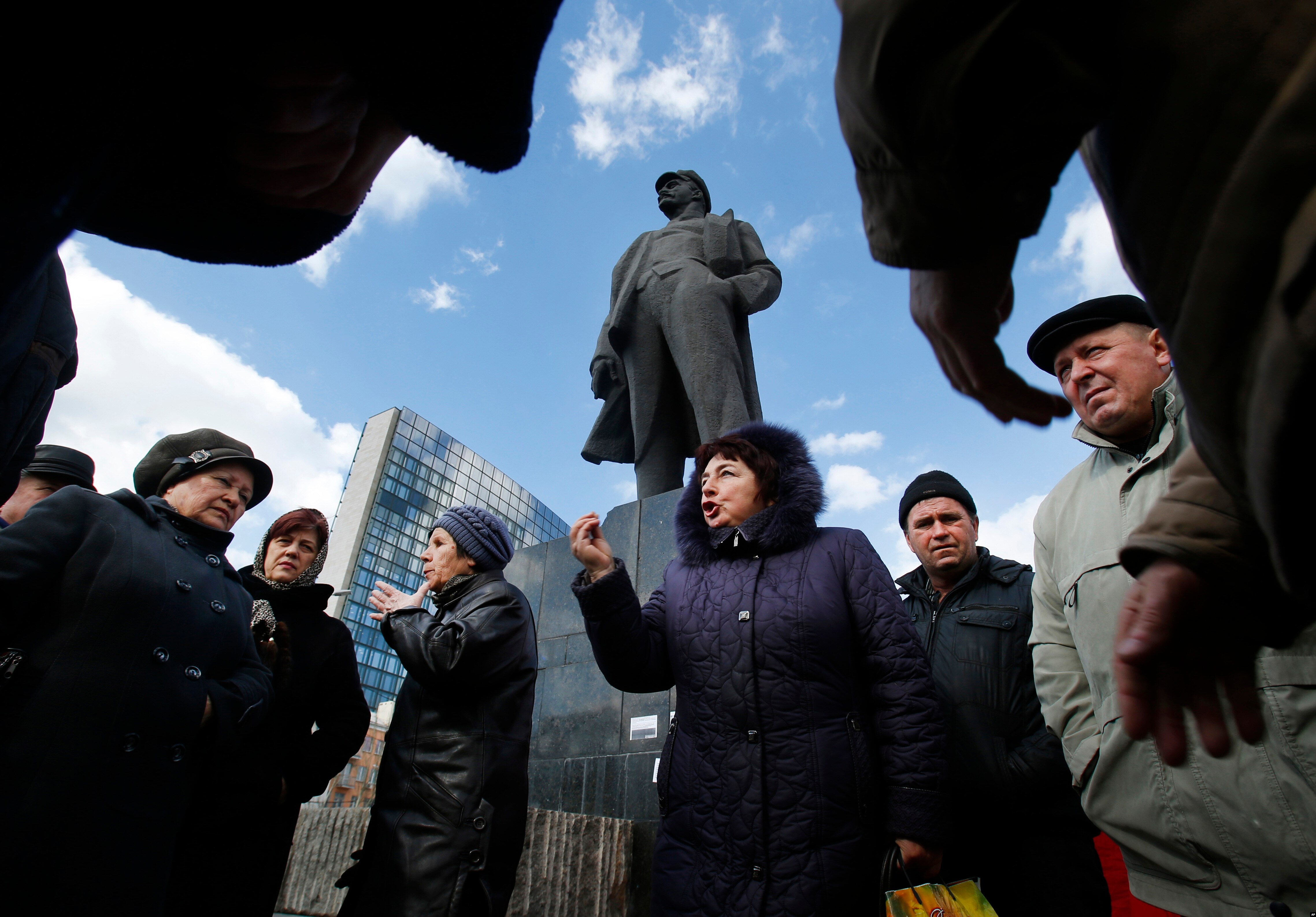 People talk about developments in Ukraine at a central square next to a statue of Soviet revolutionary leader Vladimir Lenin in Donetsk, Ukraine, March 12, 2014.
