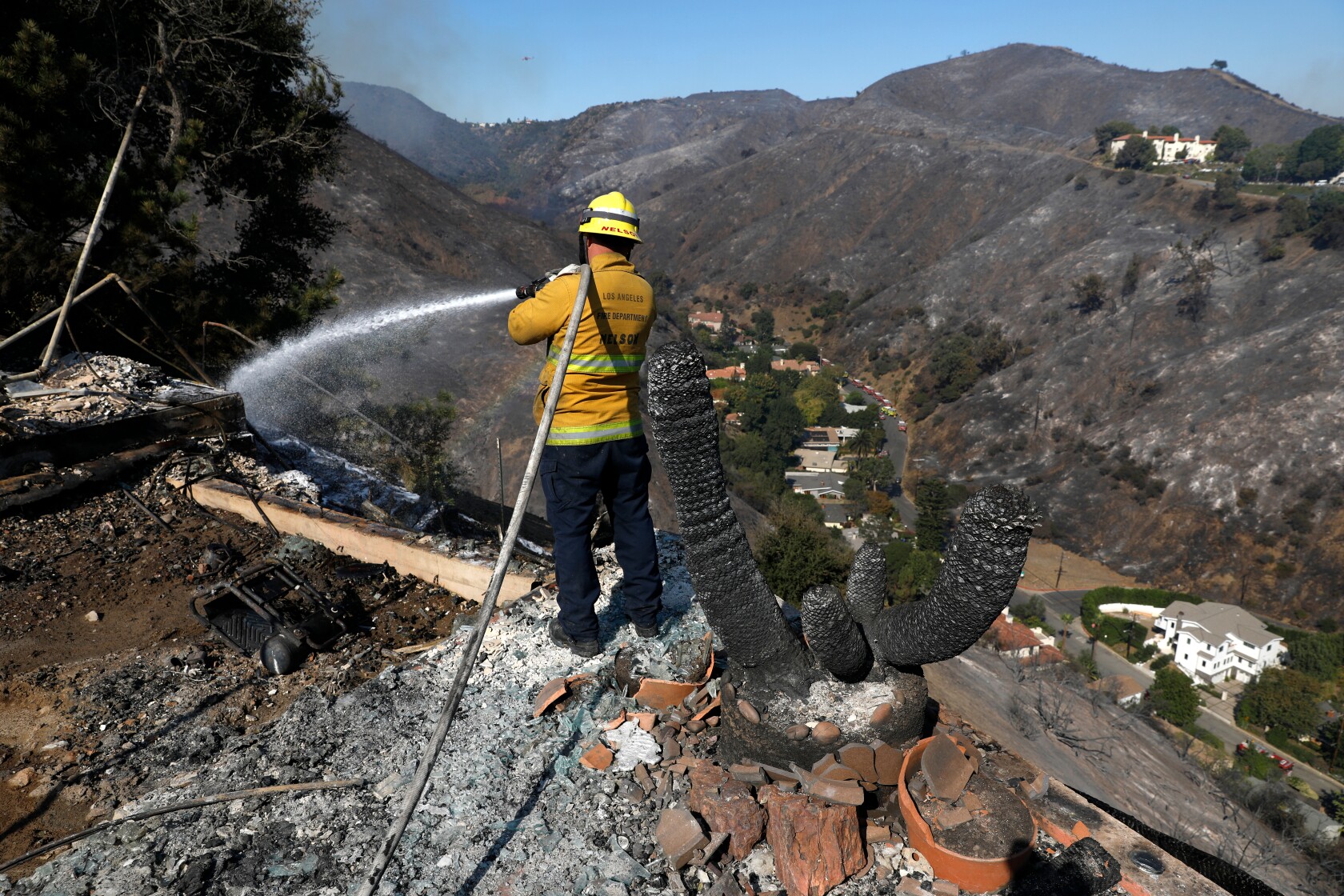 An L.A. City firefighter keeps down flames at a burned home in the 1100 block of Tigertail Road in the Brentwood Heights neighborhood of Los Angeles. (Brian van der Brug/Los Angeles Times)