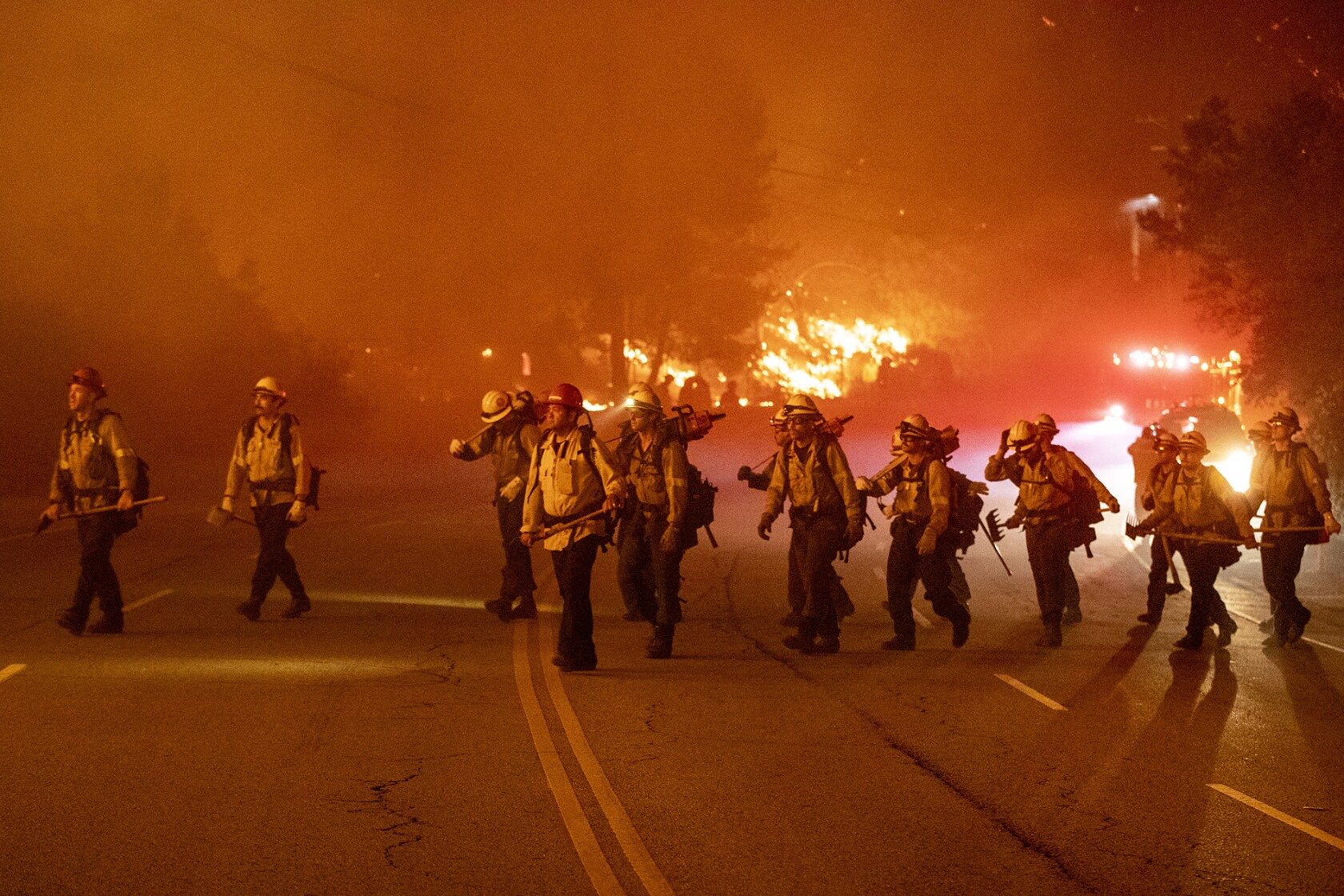 A firefighter watches flames approach the Mandeville Canyon neighborhood during the Getty fire on Monday morning. (Christian Monterrosa/Associated Press)