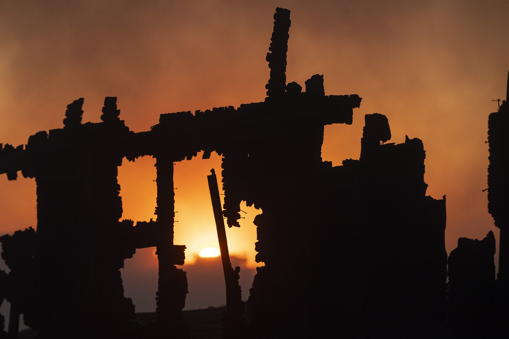 The sun rises over smoke filled canyons above the Getty museum and a burned home on Tigertail Rd. as the Getty fire burns in Los Angeles, Calif. (Brian van der Brug/Los Angeles Times)