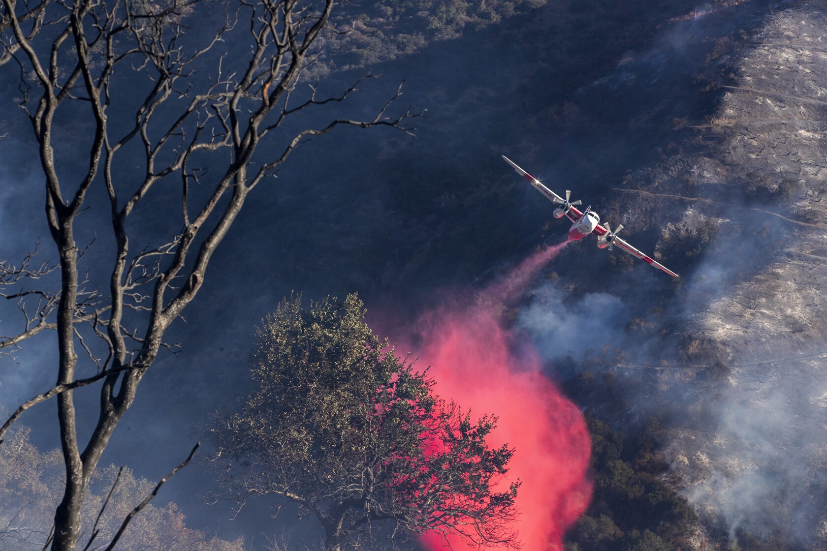 A firefighting aircraft drops fire retardant on the Getty fire in Mandeville Canyon near the Brentwood Heights neighborhood of Los Angeles. (Brian van der Brug/Los Angeles Times)