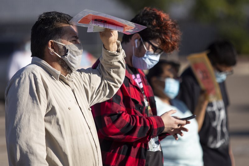 Standing with his son Diego Ramirez, Juan Ramirez waits for his turn to register his son for his senior year at Permian High School Monday morning July 27, 2020 at Music City Mall in Odessa Texas. Classes start Aug. 12 for ECISD in Odessa Texas, and registration is required for all students whether they are sending their kids to campus or staying at home for remote learning. (Ben Powell/Odessa American via AP)