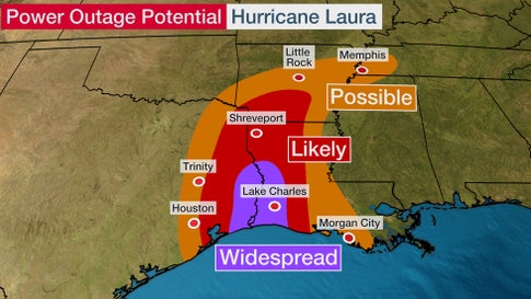 The potential for tree damage and power outages will affect areas farther inland along the path of Laura across eastern Texas, Louisiana, Arkansas and western Tennessee.