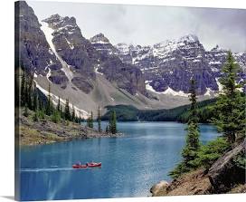 Canada, Alberta, a canoe glides across Moraine Lake in the Valley of the Ten Peaks | Large Solid-Faced Canvas Wall Art Print | Great Big Canvas
