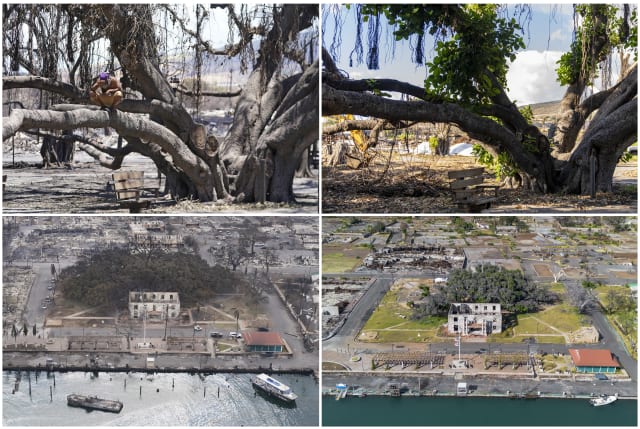 This combination of photos shows the historic Lahaina banyan tree in Lahaina, Hawaii, after the Lahaina wildfire on Aug. 11, 2023, top left, Aug. 10, 2023, bottom left, and July 6, 2024, bottom right and top right. (AP Photo)