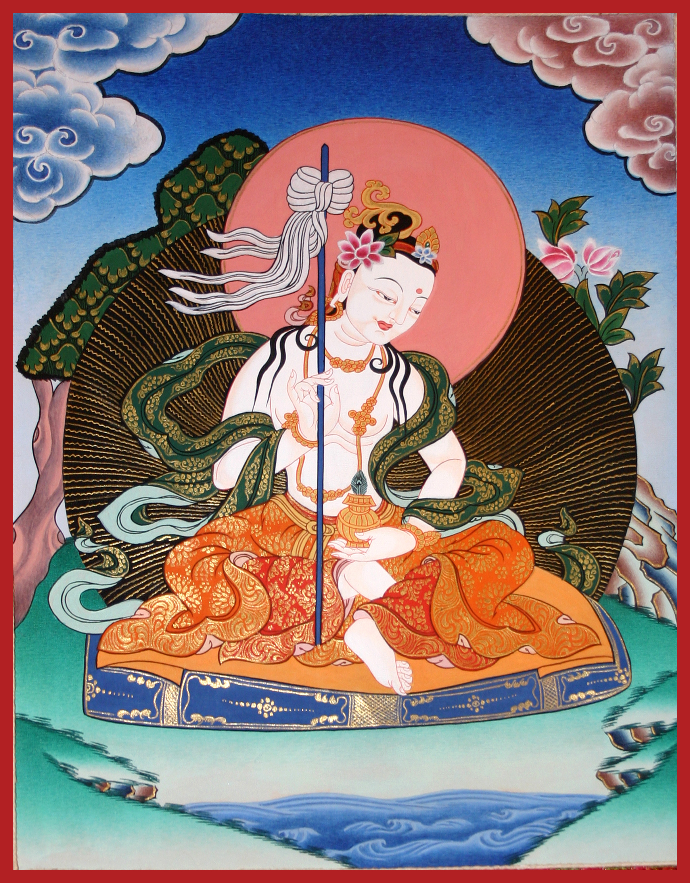According to tradition, Padmasambhava was incarnated as an eight-year-old child appearing in a lotus blossom floating in Lake Dhanakosha, in the kingdom of Oḍḍiyāna in Ancient India and in modern times identified with the Swat Valley of South Asia present-day Pakistan.[6] His special nature was recognized by the childless local king of Oḍḍiyāna and was chosen to take over the kingdom but he left Oḍḍiyāna for northern parts of India. In Rewalsar, known as Tso Pema in Tibetan, he secretly taught tantric teachings to Mandarava who was the local king's daughter. The king found out and tried to burn him but it is believed when the smoke cleared he was intact and in meditation. The king offered Padmasambhava his kingdom and Mandarava. He left with Mandarava and later in Maratika Cave in Nepal