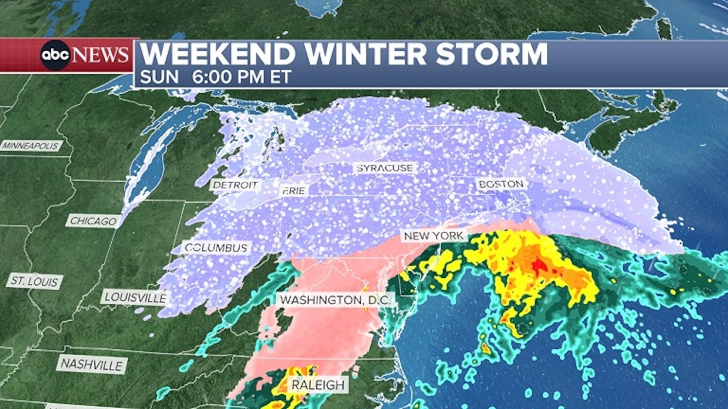 Between 11 a.m. and 4 p.m. Sunday, a band of heavy snow and a wintry mix could bring snowfall rates of 1 inch per hour to the Interstate 95 corridor. Philadelphia will likely get a wintry mix or freezing rain, while New York City and areas to the north will get snow.