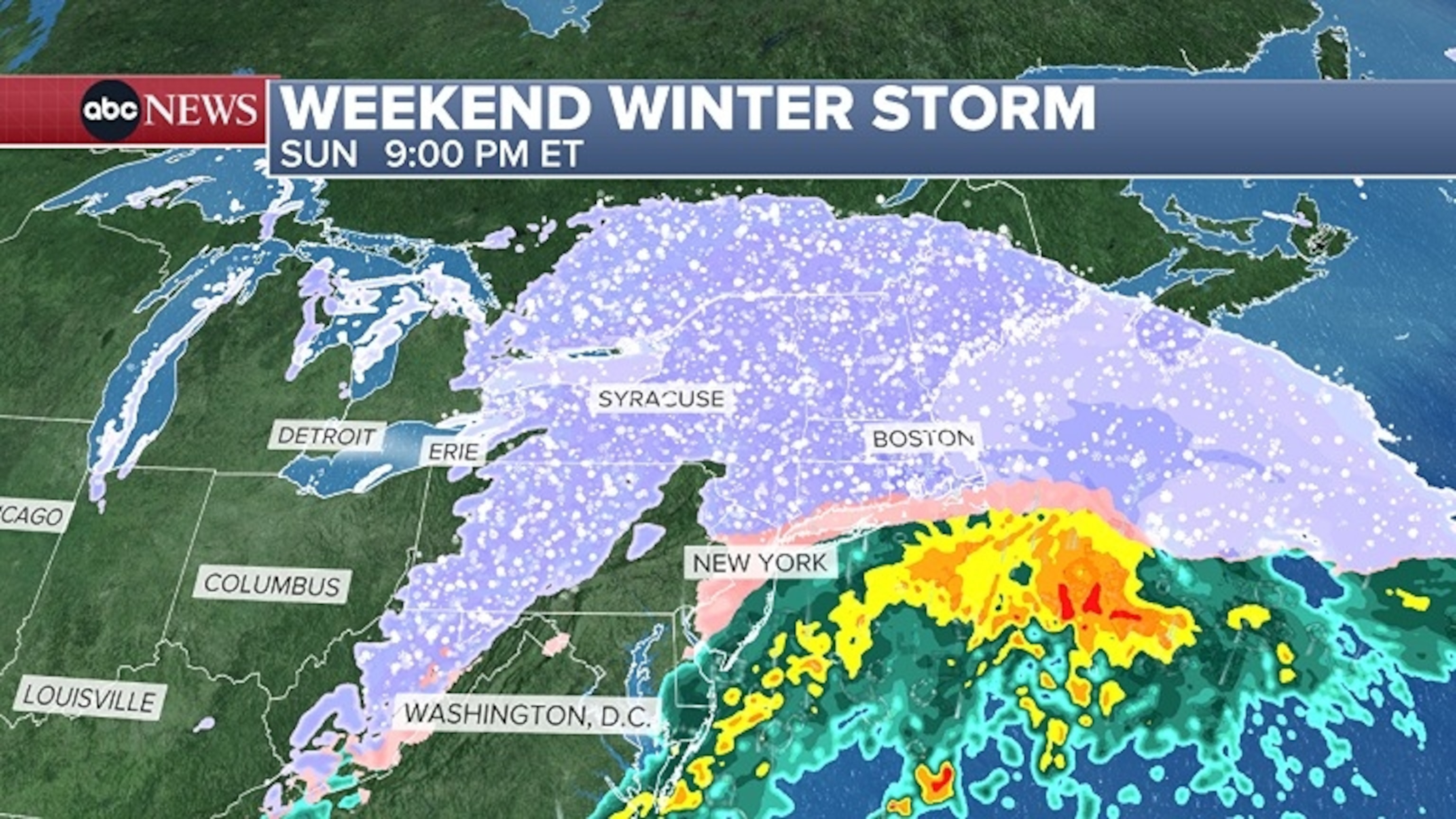 By Sunday evening, the heavy snow will reach New England. Some light snow could linger in the Northeast into Monday morning.