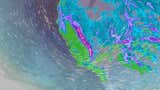 Forecasted storm systems, cold and warm fronts, and rain and snow areas.