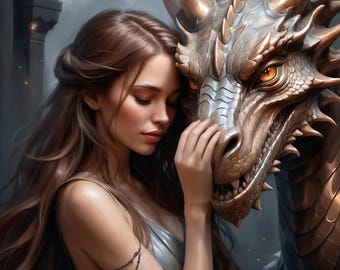 Woman and Giant Dragon Digital download - Fantasy - AI Generated Art Print Printable Poster Image stock photo JPG