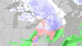 Forecasted storm systems, cold and warm fronts, and rain and snow areas.