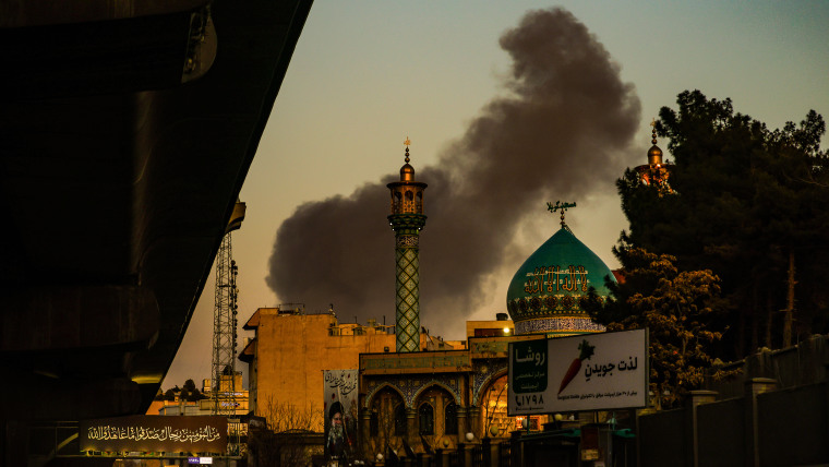 A plume of black smoke rises above the city skyline in Tehran.